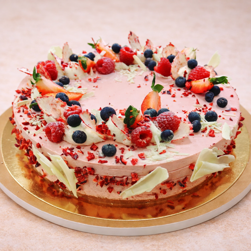 Sastāv no: sviesta cepumu pamatnes un aveņu biezeņa mussa. Dekorē ar svaigā siera krēmu, balto šokolādi un ogām.