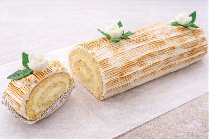 “Génoise” biskvīta ruletē ietīts dabīgs citrona sulas krēms, Grand Marnier liķieris, un pārklāts ar gaisīgu olbaltumu krēmu.