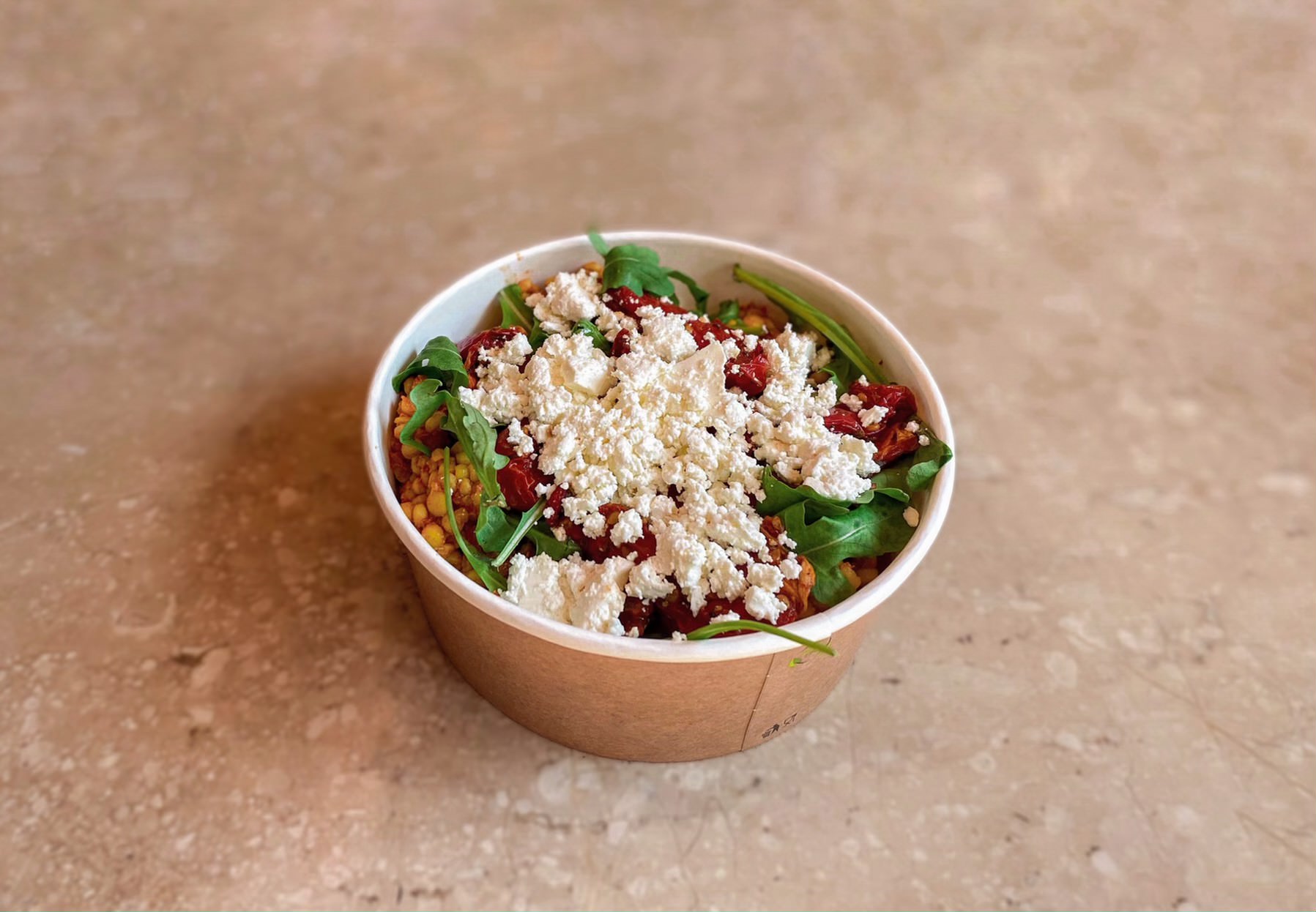 Pērļu kuskusa salāti ar confit tomātiem un fetas sieru daudzums